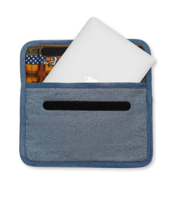 Made from repurposed products with a soft poly scarf lining, this denim laptop sleeve offers durable protection and a unique, textured look. It’s the perfect balance of practicality and personality.