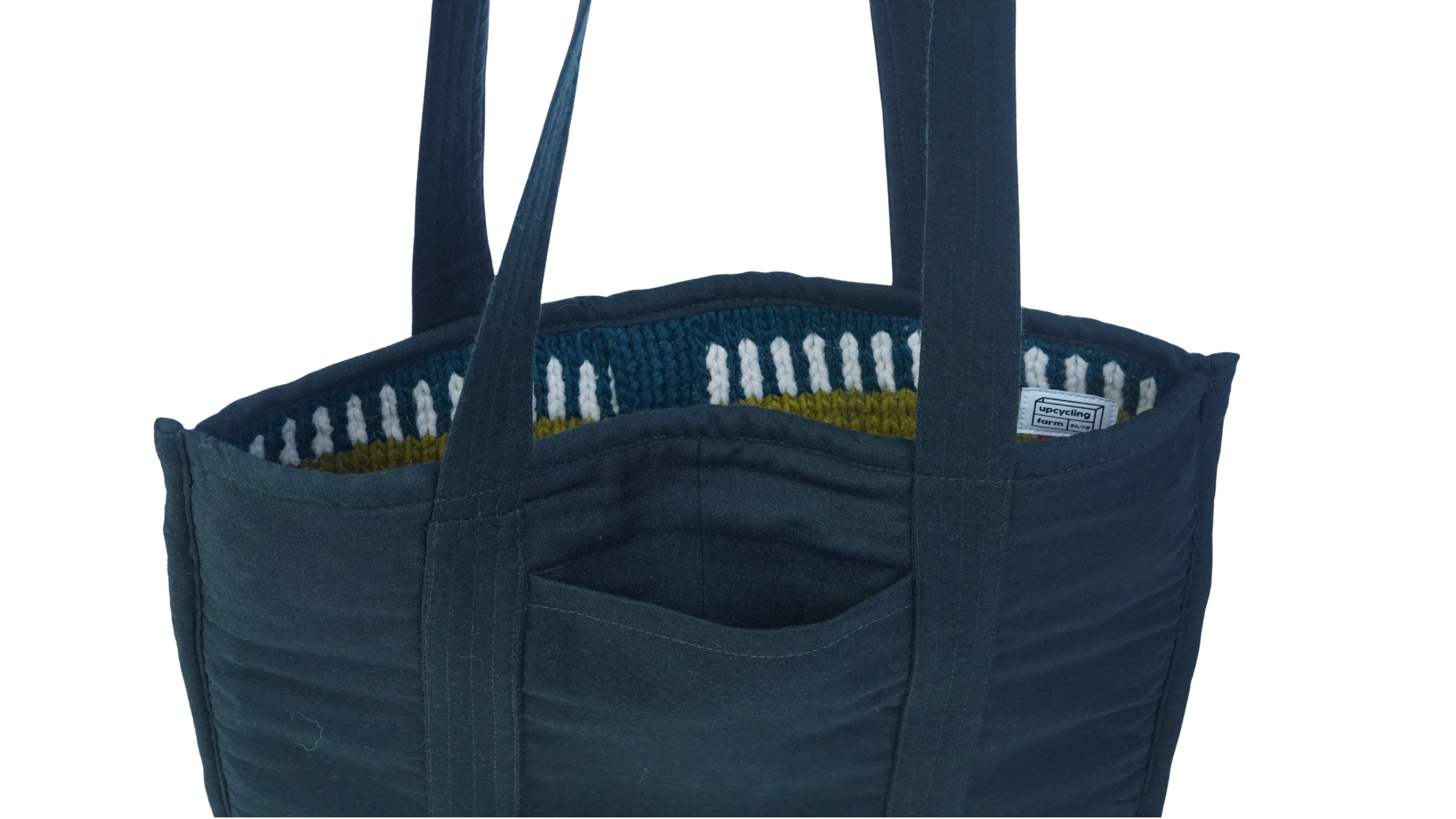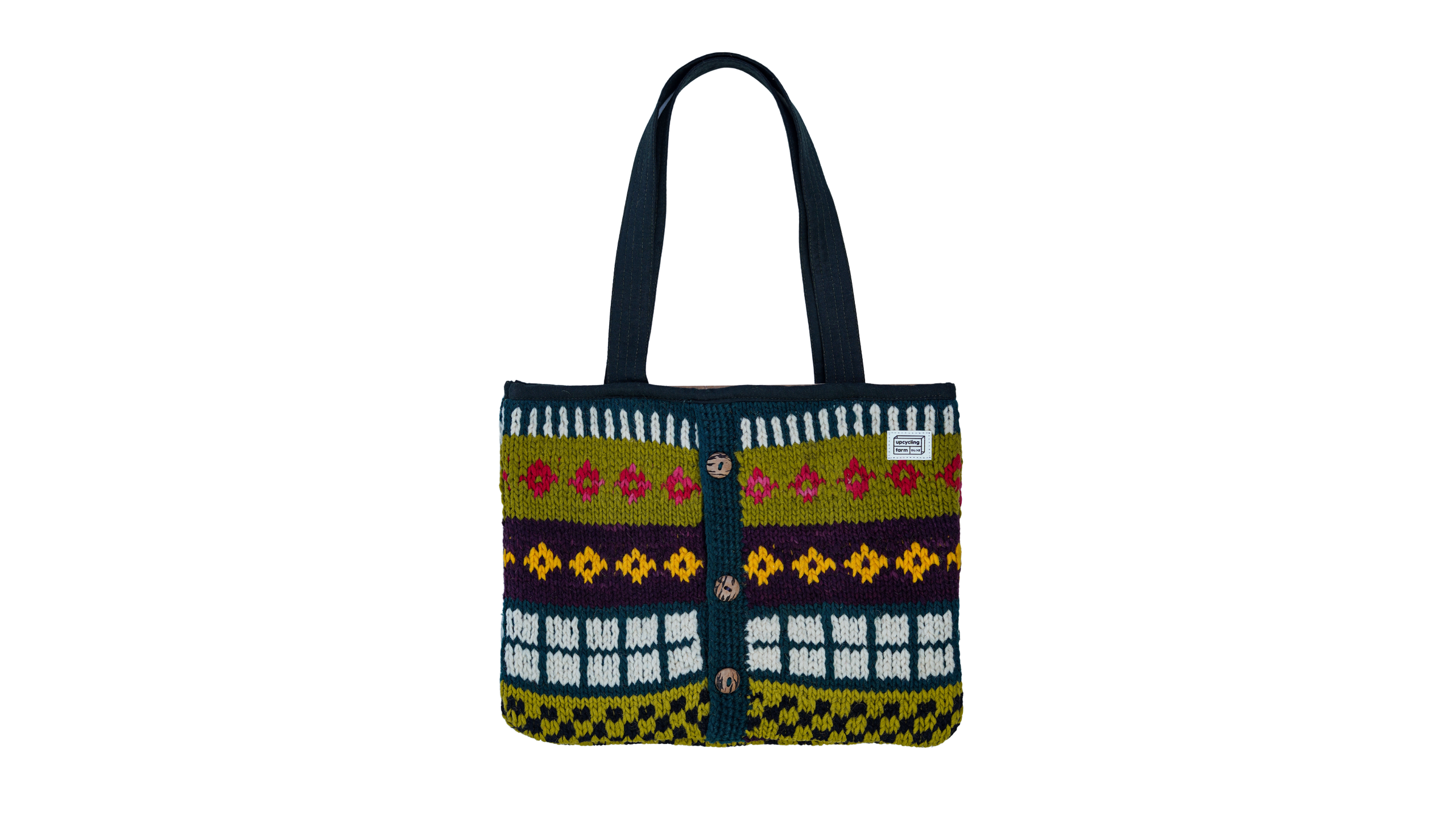 Playful, bold, and full of character, the Cottage Carnival Tote Bag celebrates traditional knit patterns through a lively mix of colors and textures. Crafted entirely from upcycled wool, this tote transforms pre-loved knitwear into a functional everyday accessory with a one-of-a-kind look.