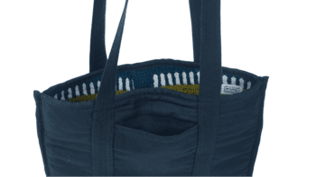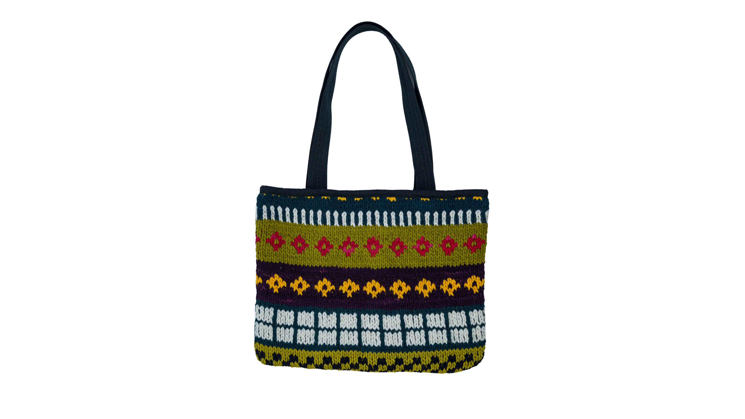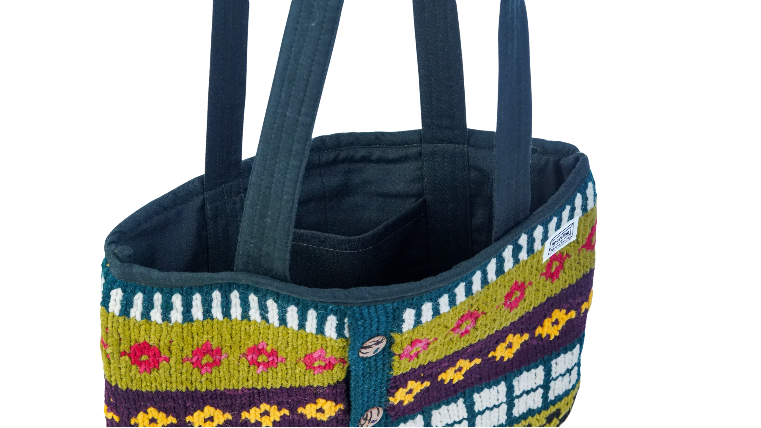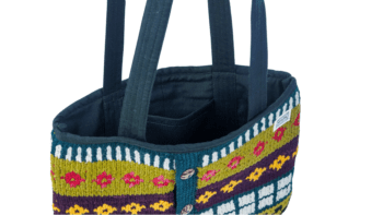 The Cottage Carnival Tote Bag is made from upcycled wool, featuring vibrant knit patterns inspired by folk textiles. Designed for everyday use, it includes a spacious interior with an inner pocket for easy organization