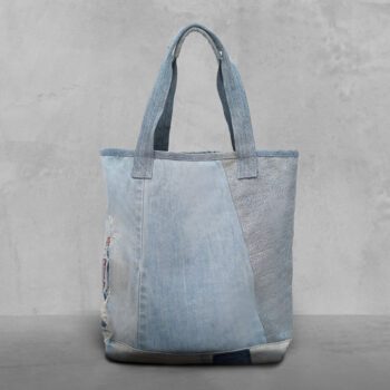 Designed for those on the move, this tote combines repurposed denim with soft wool lining for a refined yet durable carry. Its versatile design ensures you travel light while making a statement in sustainable style.