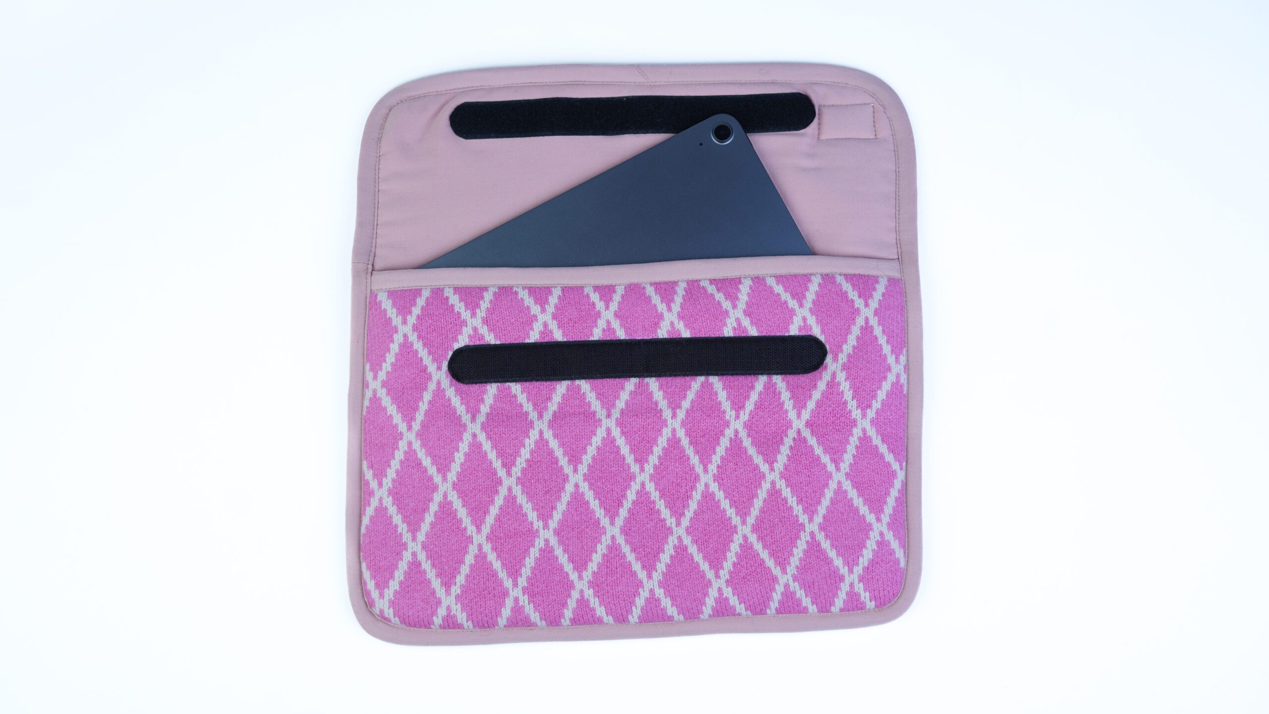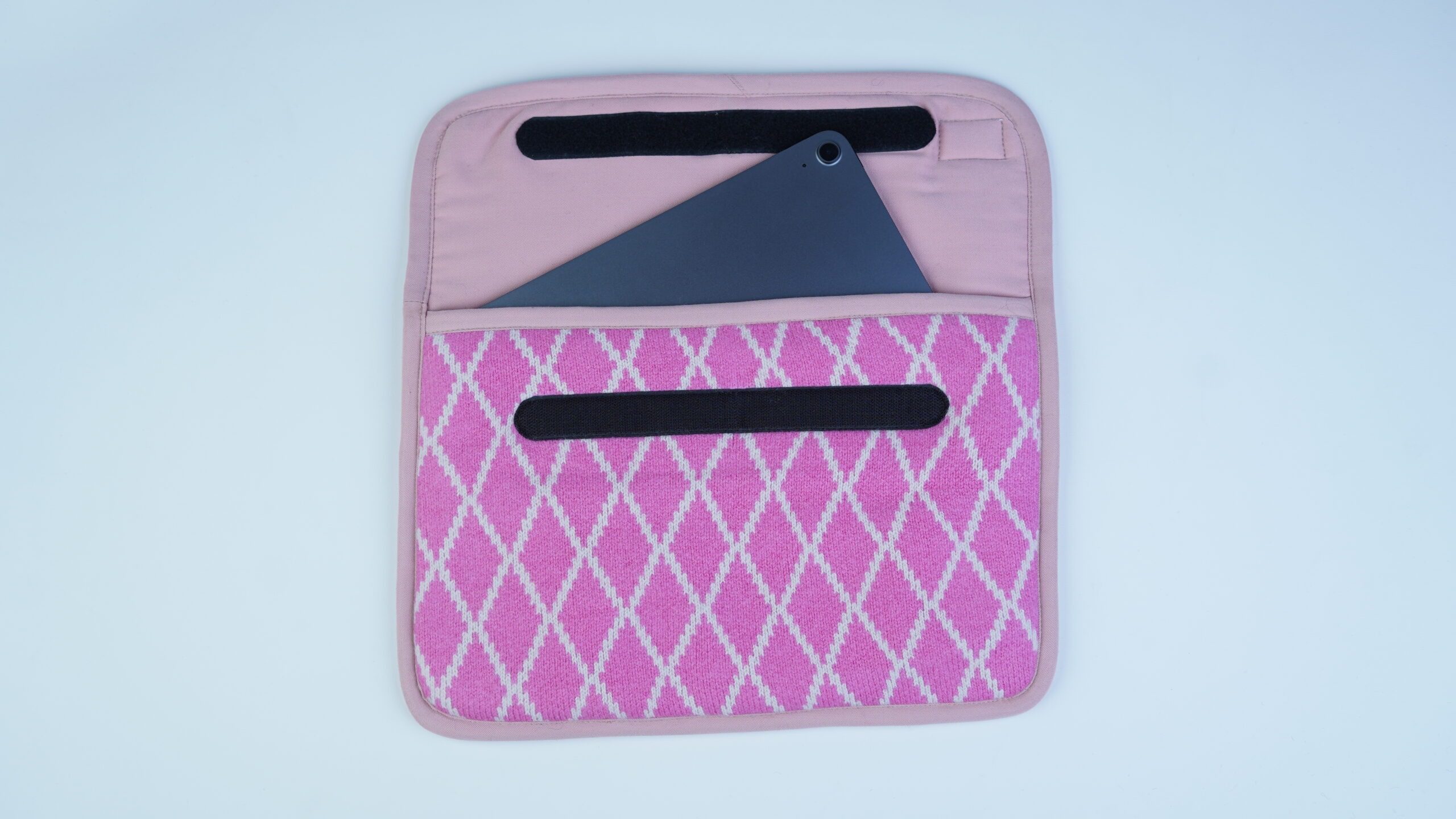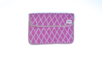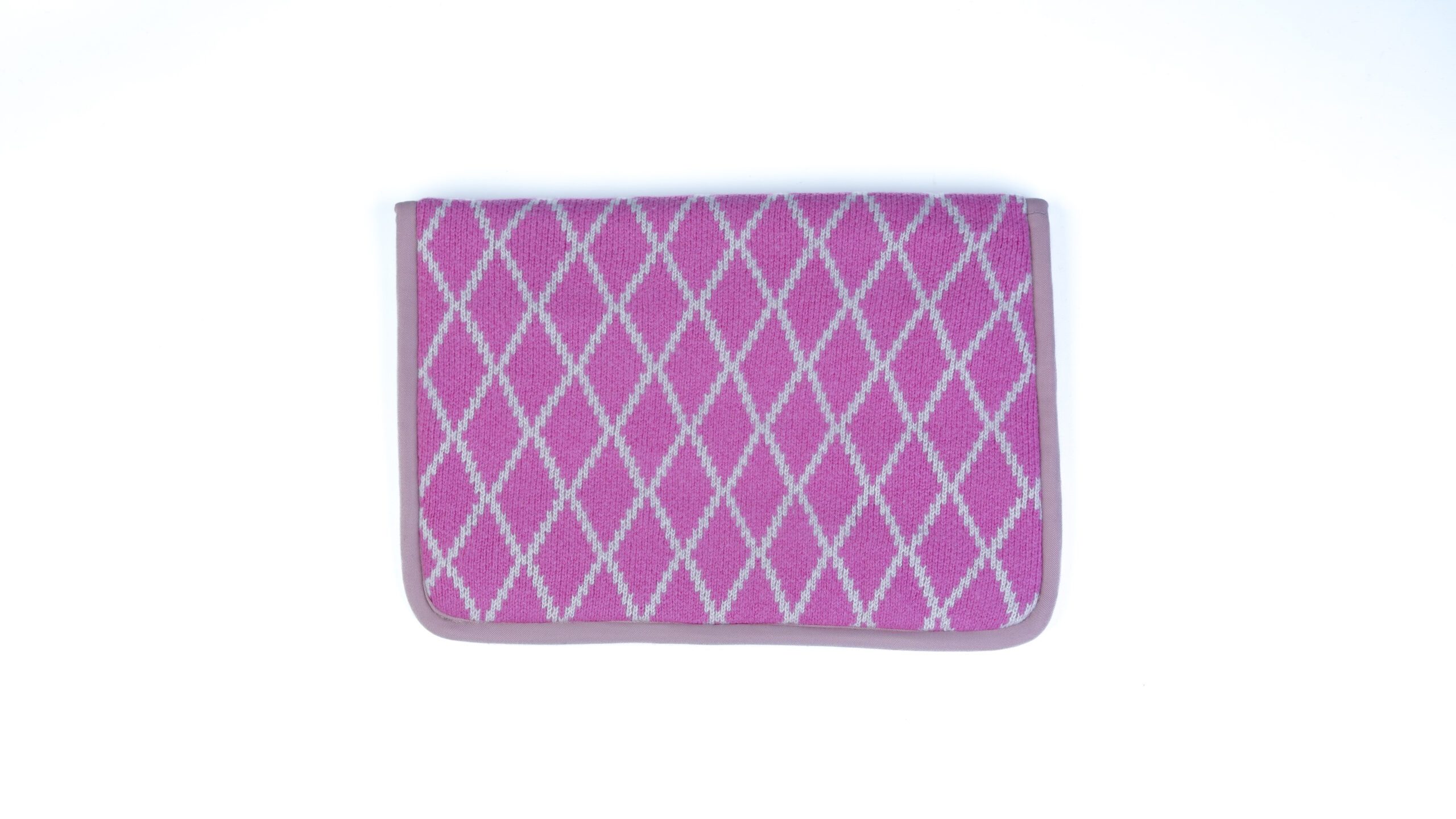 The Diamond Rose Wool Laptop Sleeve features a soft knitted wool exterior with a fine wool lining, providing everyday laptop protection wrapped in a charming pink diamond pattern.