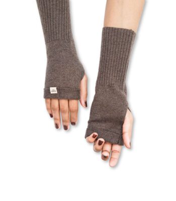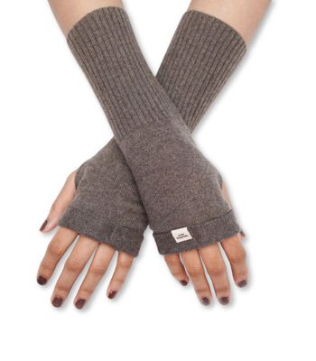 Flexible, soft cashmere gloves in a neutral taupe shade, derived from discarded jumpers for everyday comfort and effortless wear.