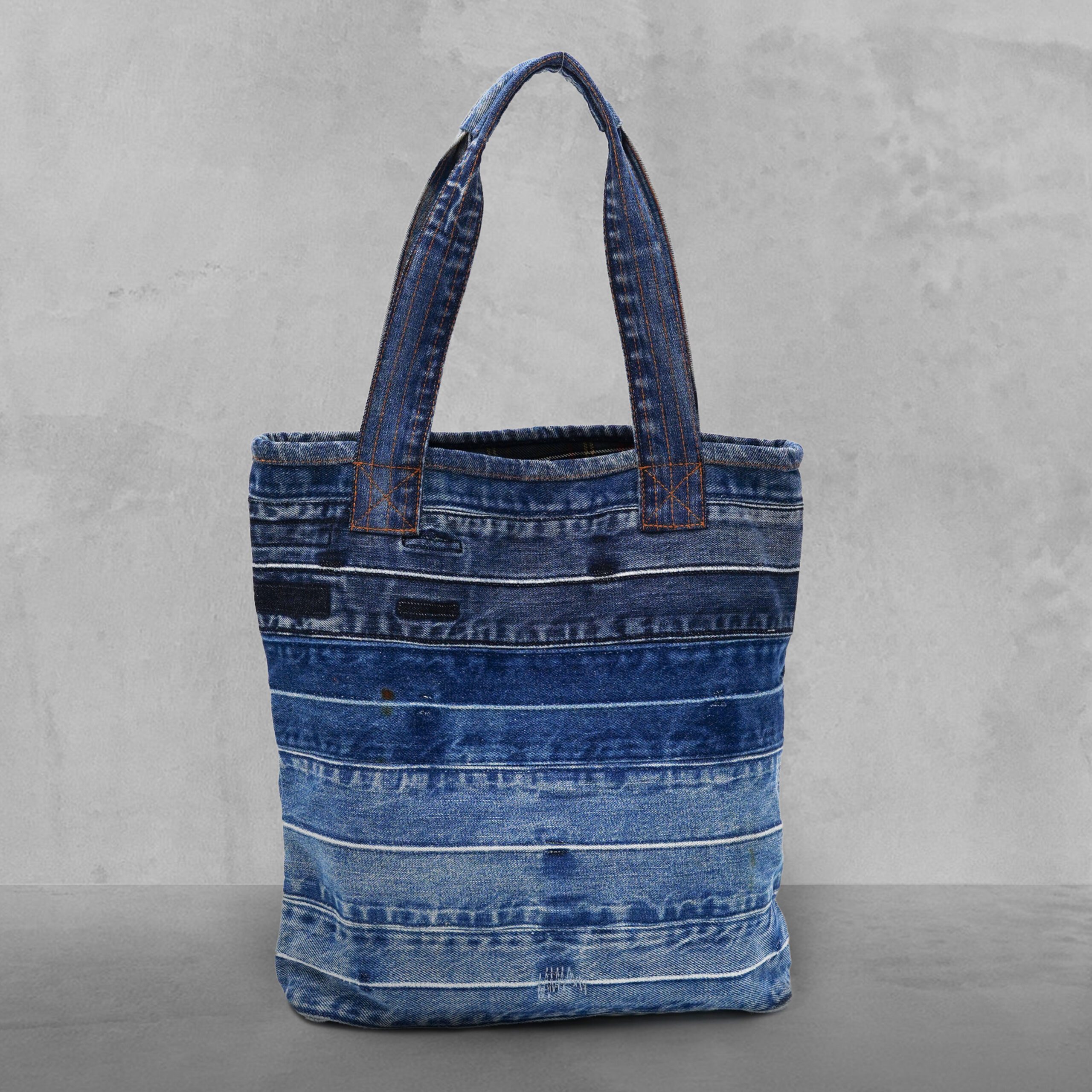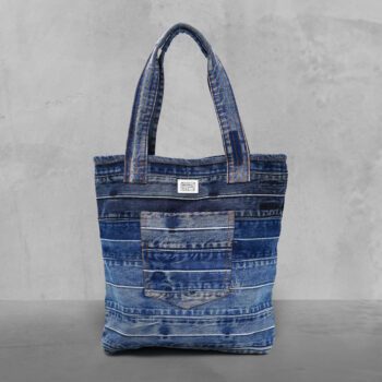 The sturdy 19” handles ensure a comfortable grip, while the practical 6” x 7” pocket keeps your phone, keys, or wallet within reach. Featuring a striking patchwork denim exterior, this bag is perfect for those who appreciate timeless design with a modern, eco-conscious touch.