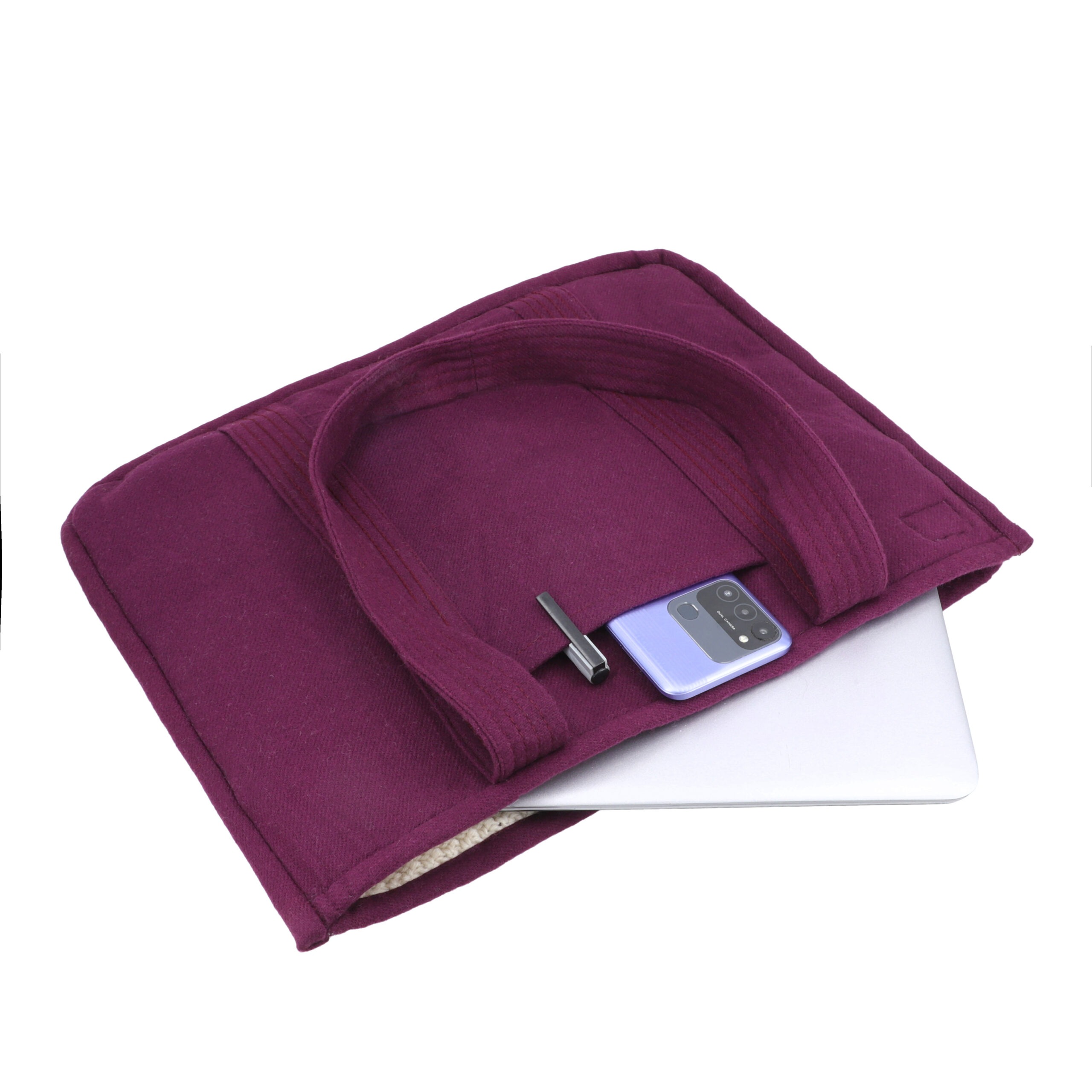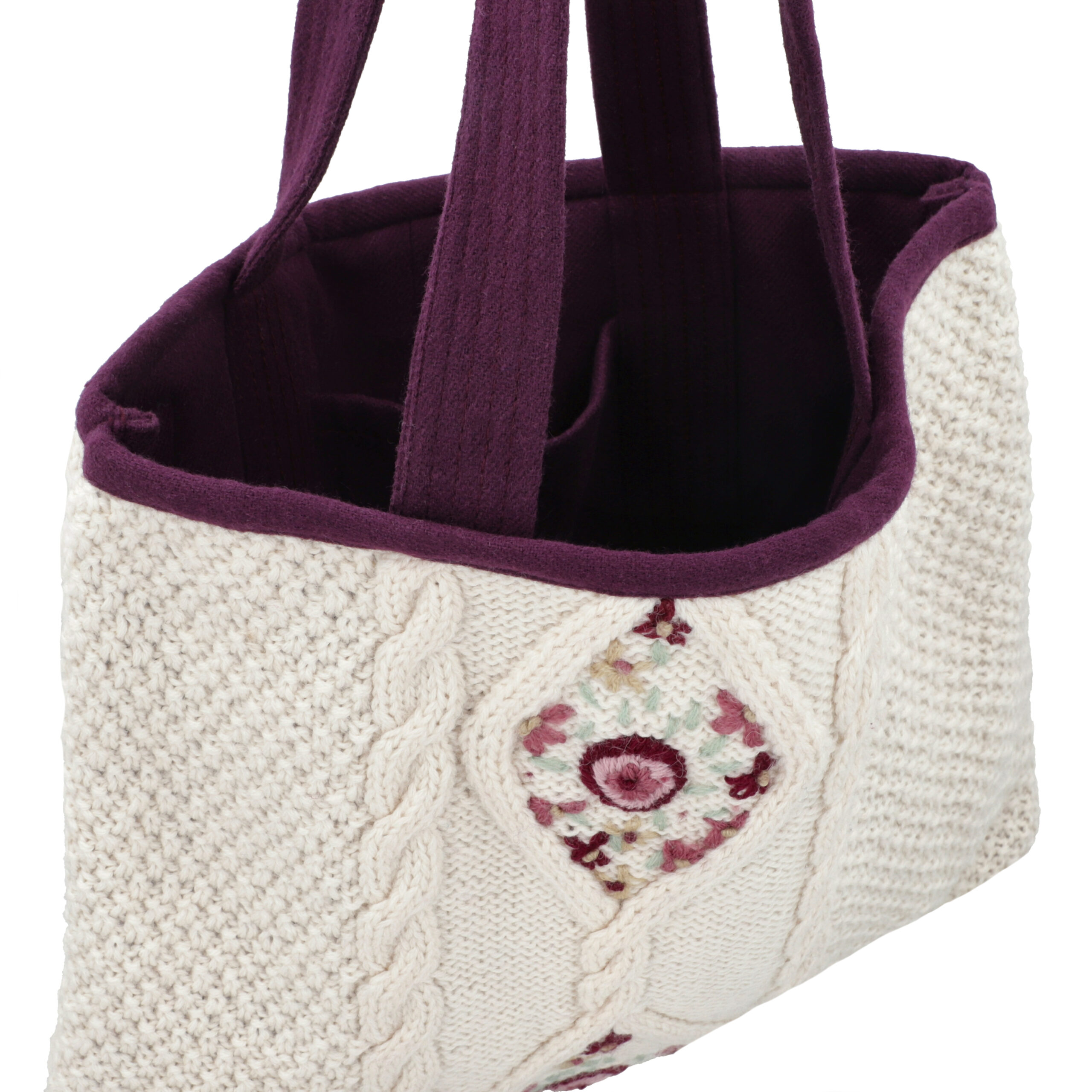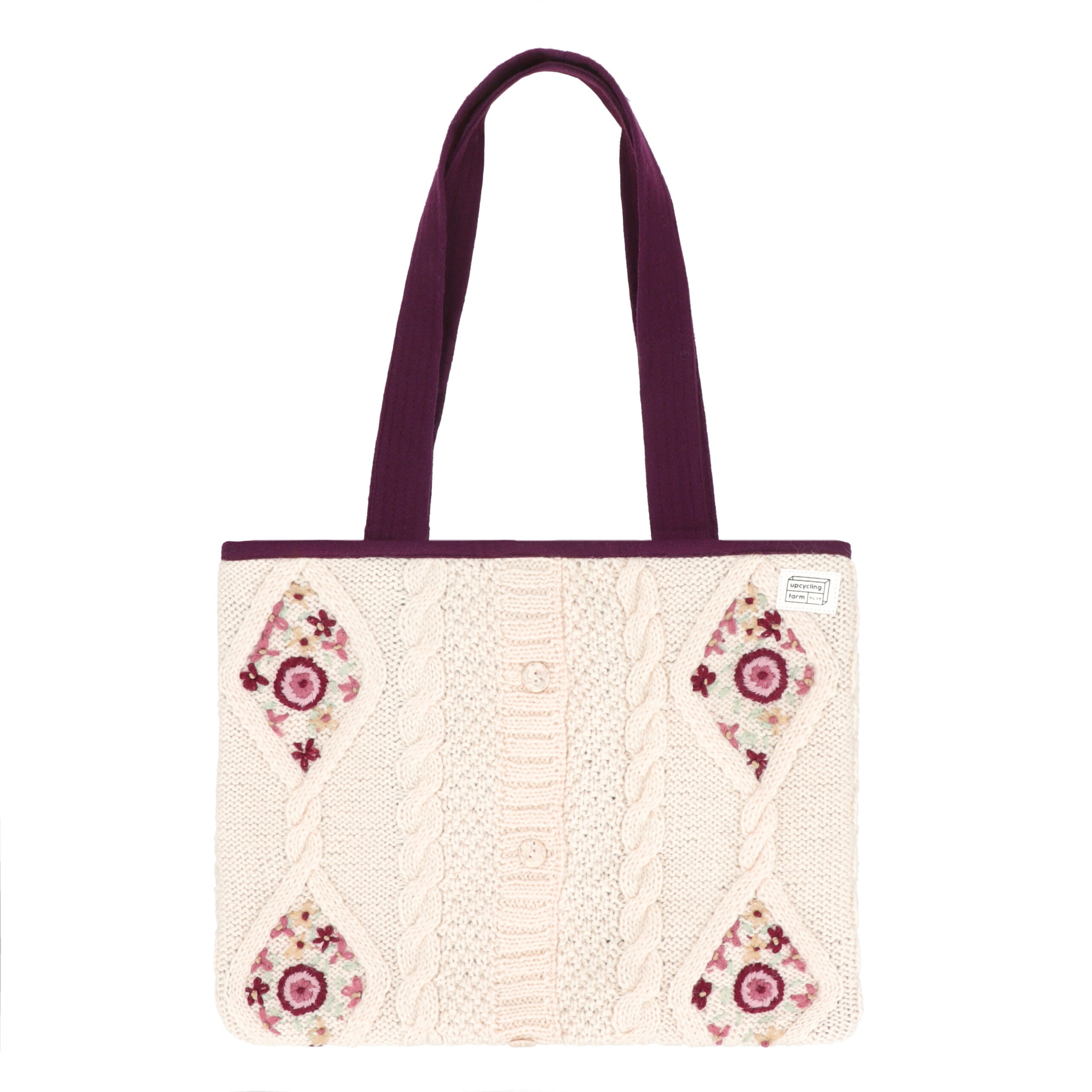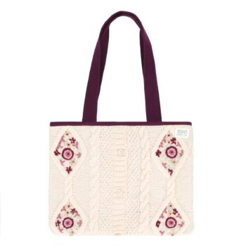 Refined, cozy, and consciously made—meet our Ivory–Purple Reversible Tote Bag, created from 100% upcycled wool sweaters. One side showcases a beautifully textured ivory knit with subtle embroidery that adds a handcrafted charm, while the reverse reveals a rich purple wool interior for a bold yet sophisticated contrast.