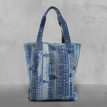 The Ocean Chevron Tote blends repurposed denim with a bold diagonal design and a soft wool lining. With a handy pocket and comfortable handles, it’s a versatile companion for everyday outings.
