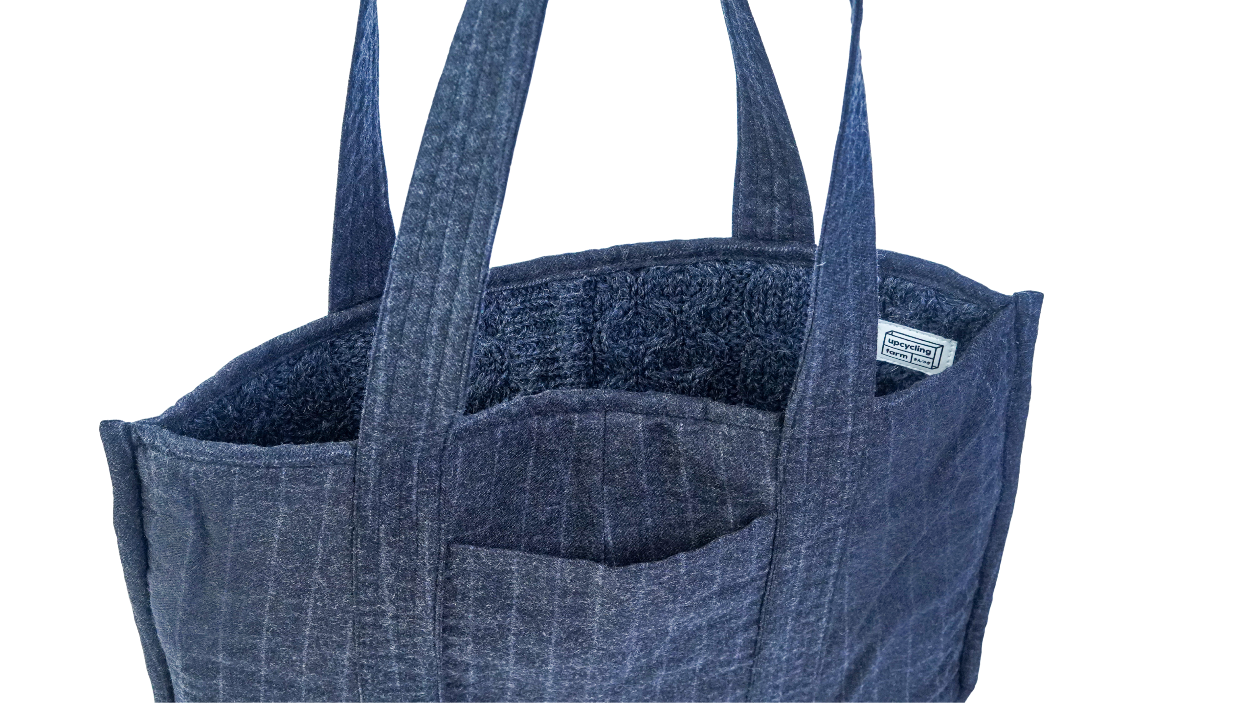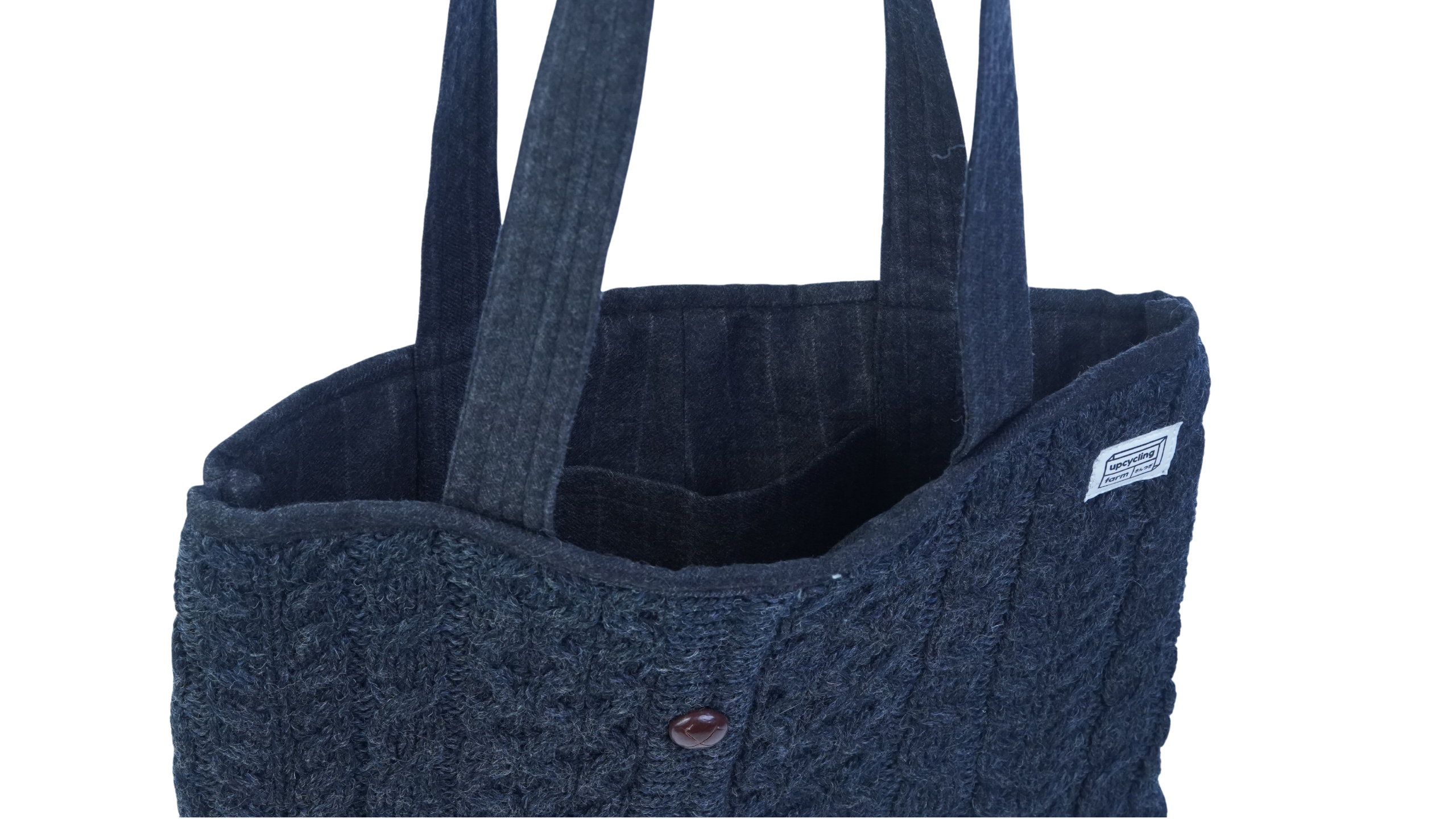 Introducing our reversible Cable Knit tote bag in Onyx Black, made from 100 percent upcycled sweaters. Featuring a deep onyx knit exterior with classic button detailing, paired with black straps and a smooth wool interior, this tote brings strength, depth, and everyday practicality together. Finished with a useful inner pocket.