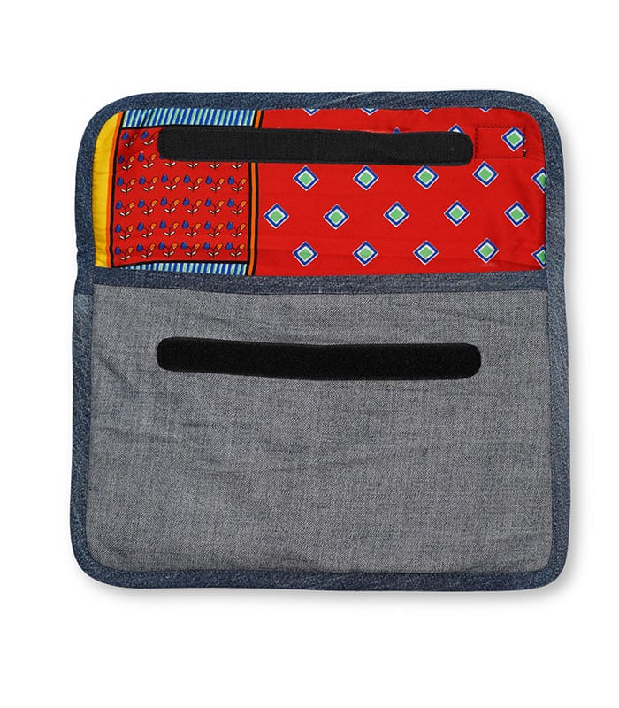 This Ruby Red, repurposed laptop sleeve offers durable protection with a soft poly scarf lining, keeping your device safe while adding a bold, stylish flair.