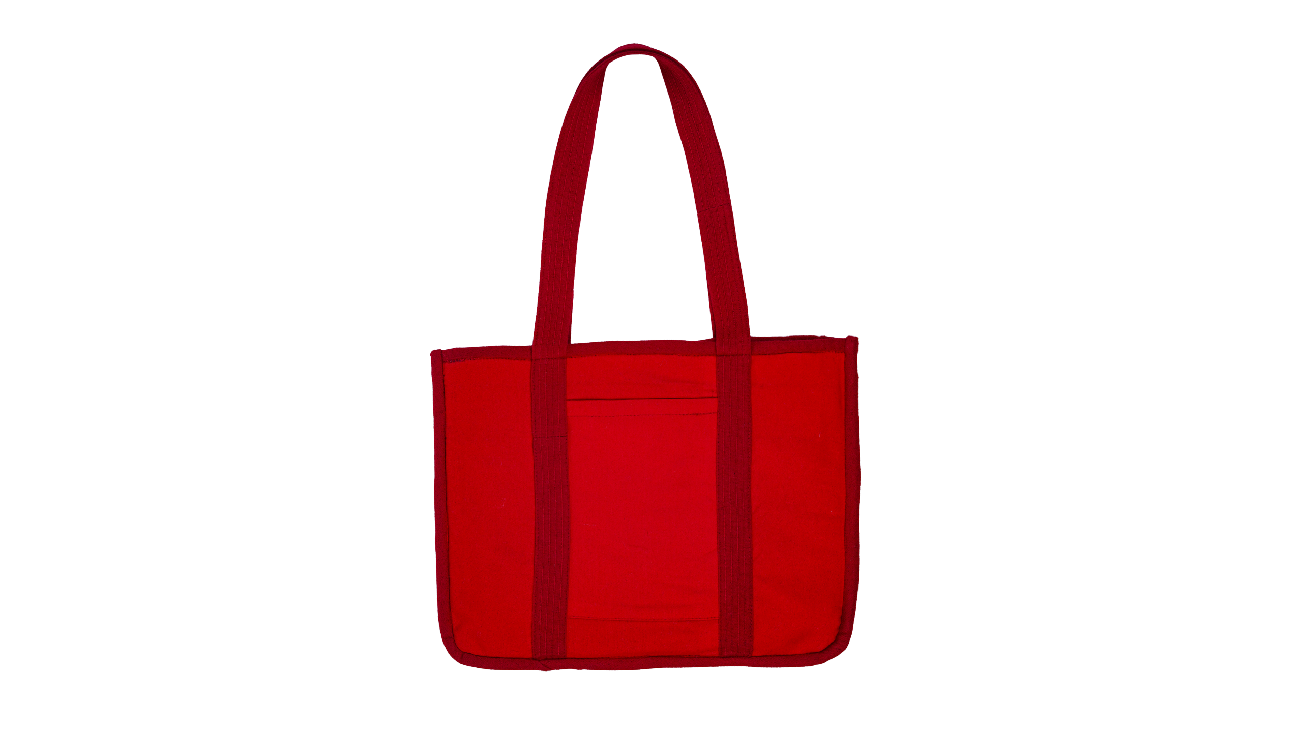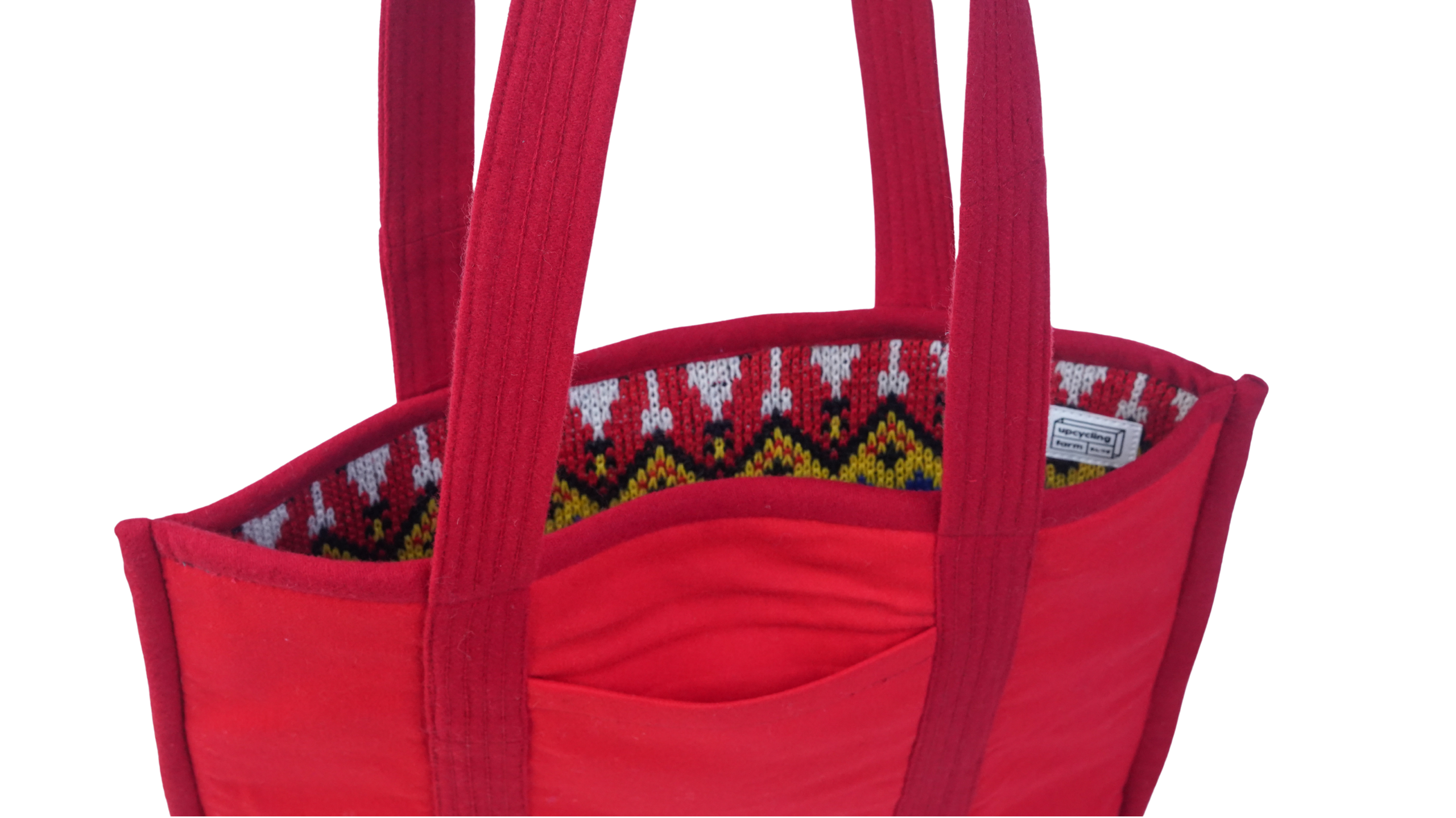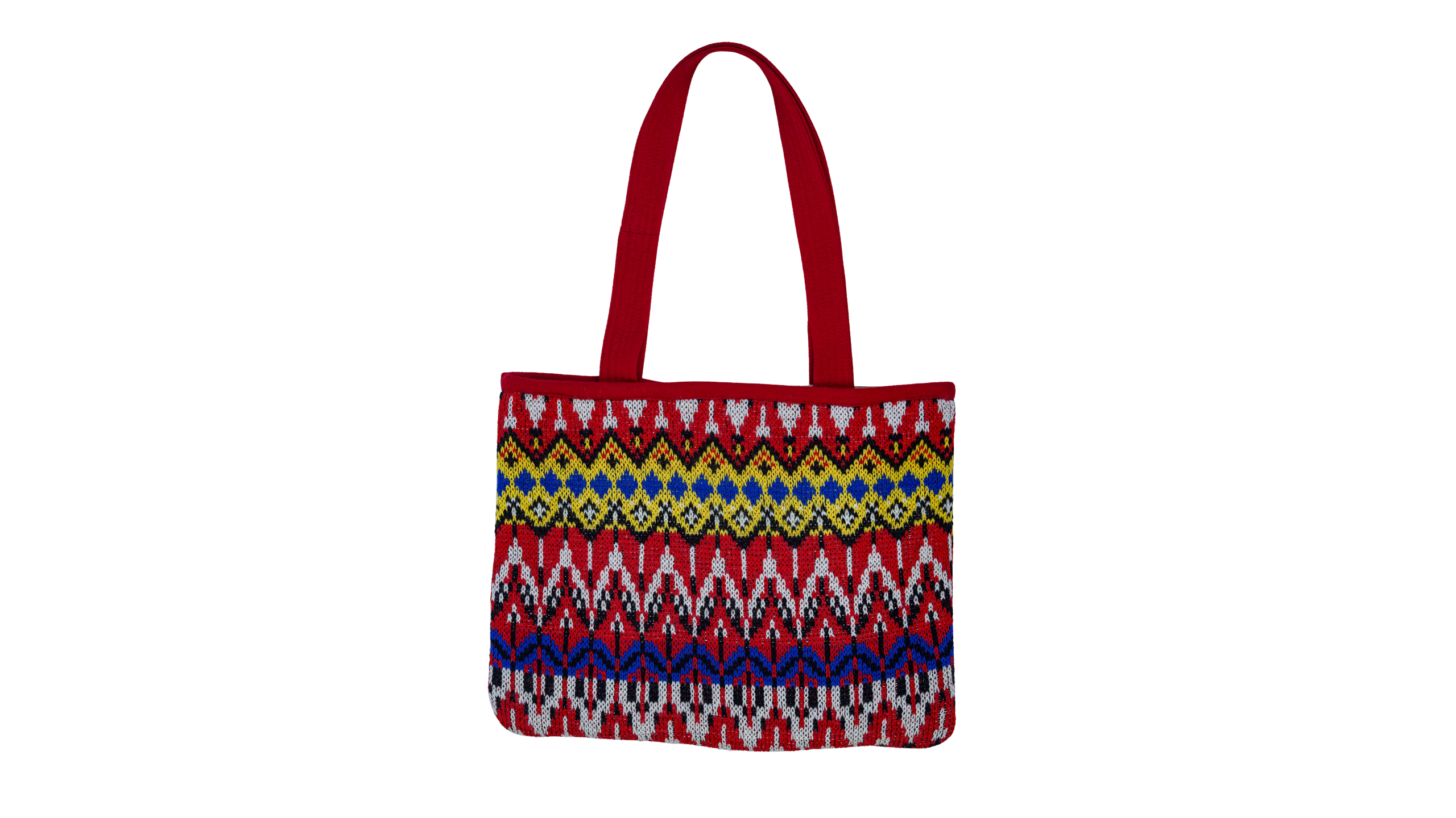 The Ruby Tapestry Tote Bag is crafted from 100% upcycled wool, featuring a vibrant red base layered with intricate multicolor knit patterns. Designed for everyday use, it is reversible and includes an interior pocket to keep essentials neatly organized.