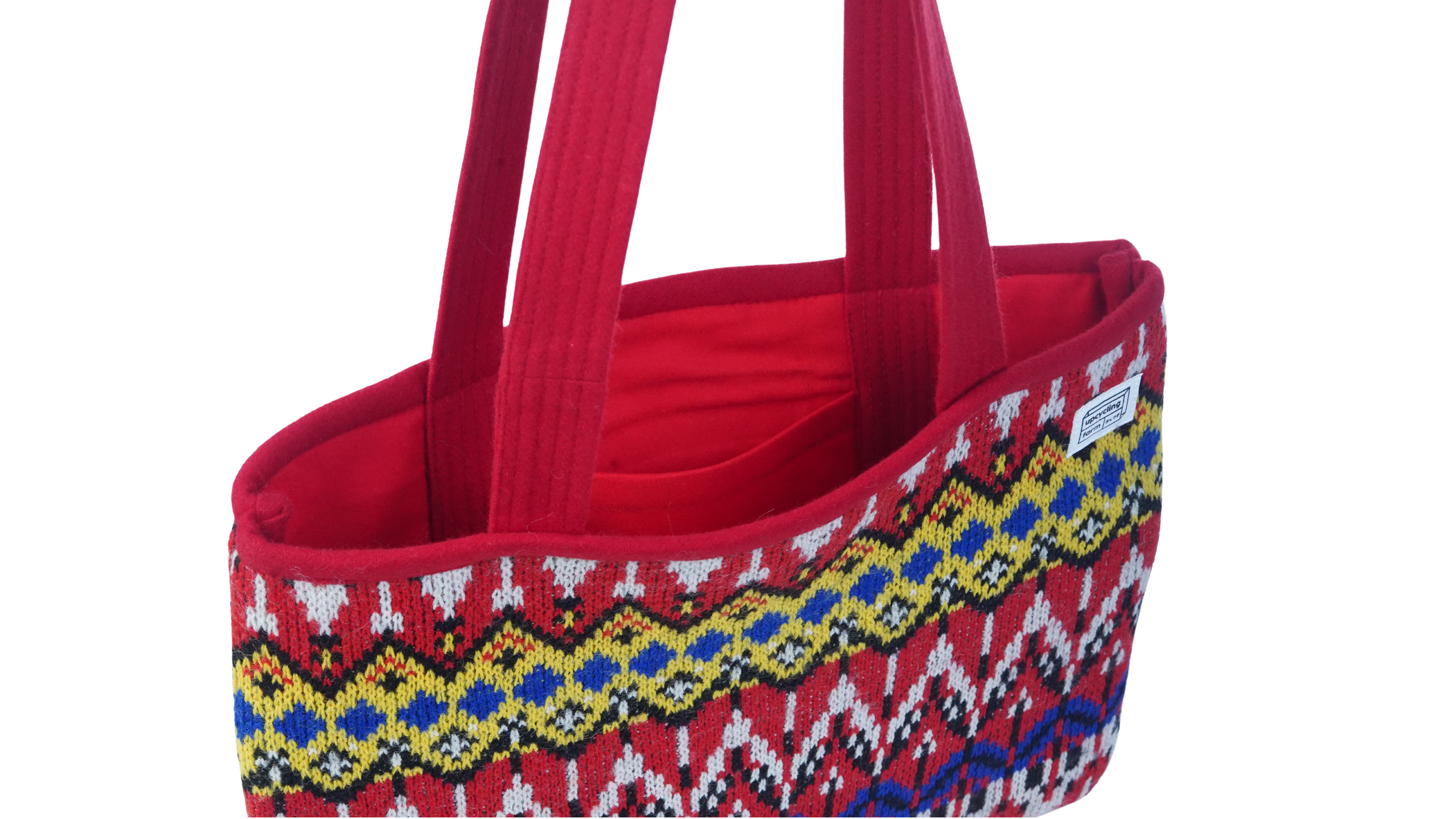 Bold, expressive, and rich in texture, the Ruby Tapestry Tote Bag is made entirely from upcycled wool, giving pre-loved knitwear a renewed life through thoughtful artisanship. Its design highlights a striking interplay of crimson tones with detailed geometric motifs, drawing inspiration from traditional fair isle knits and festive woven textiles.