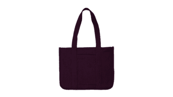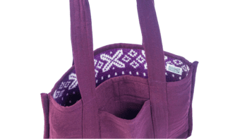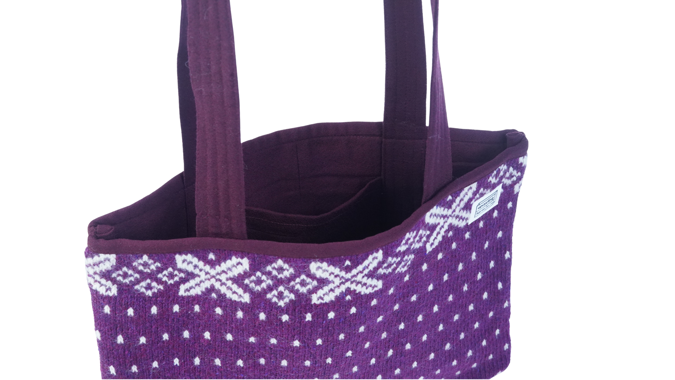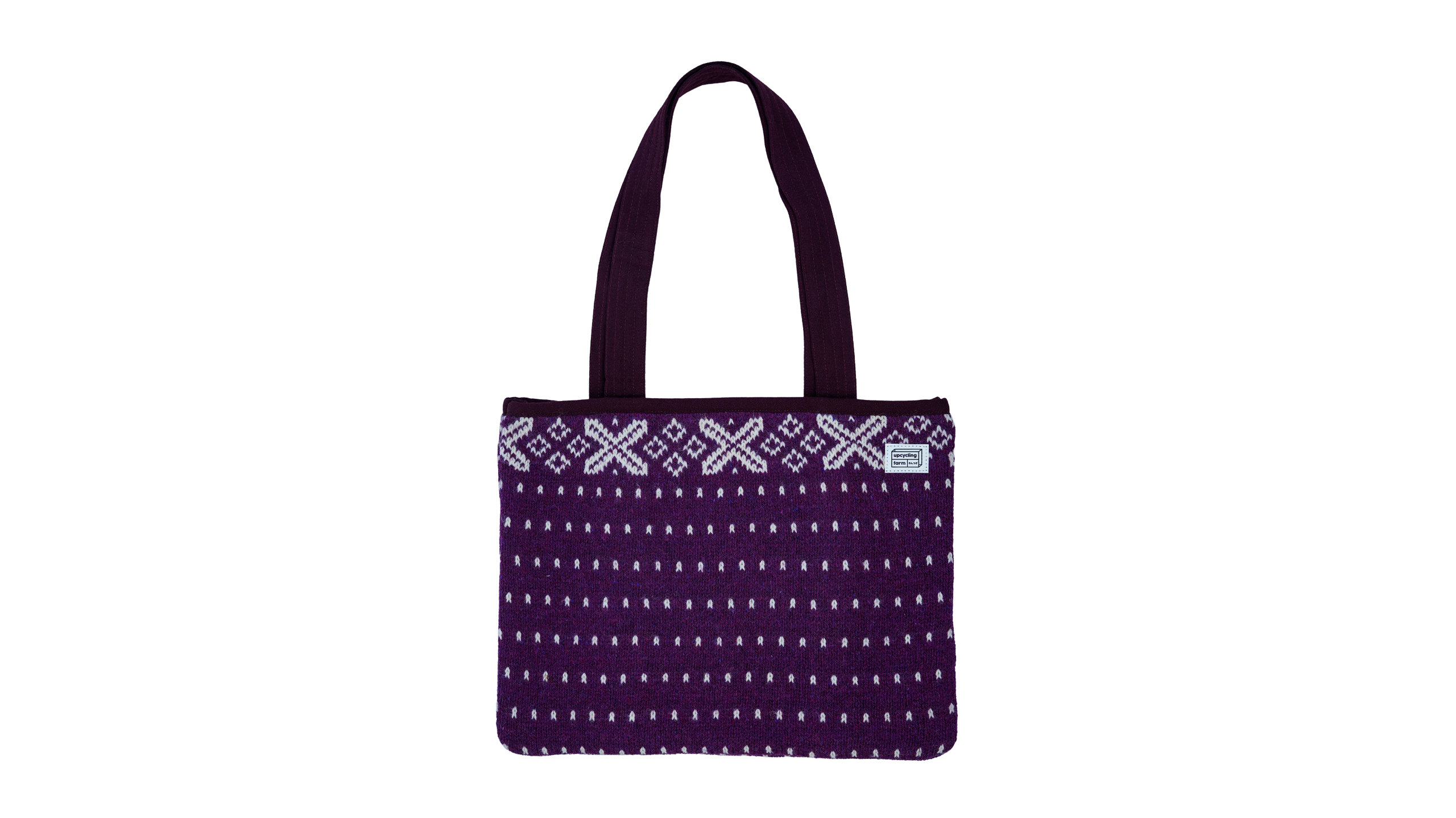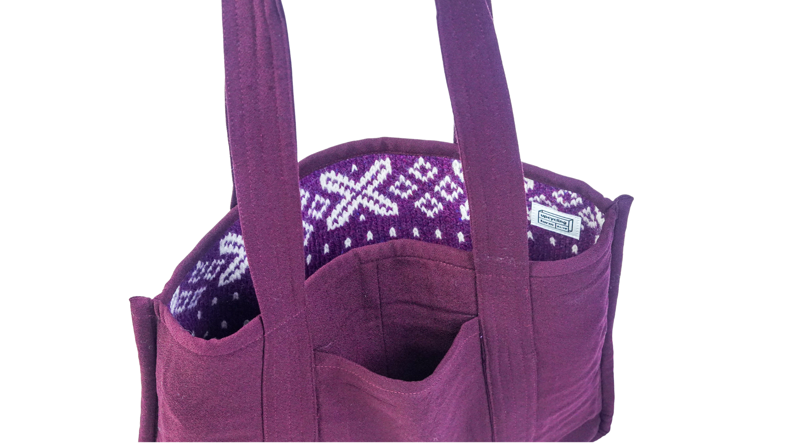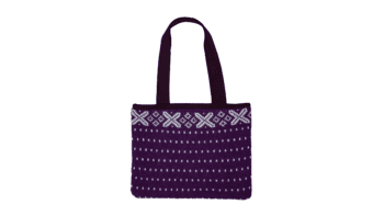 The Violet Tapestry Tote Bag is crafted from 100% upcycled wool, featuring a richly textured knit body with an intricate woven pattern in deep violet tones. Designed for everyday use, it is reversible and includes an interior pocket to keep essentials neatly organized.